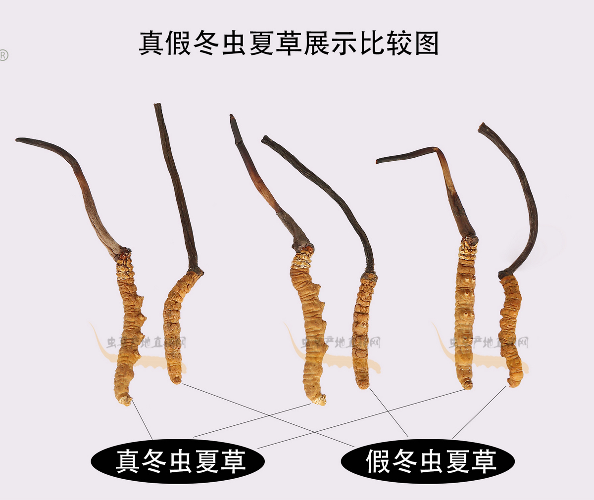 以上圖片,將這種產(chǎn)自四川和云南、極易被不法商家用來冒充正品的假冬蟲夏草與真冬蟲夏草的外形特征區(qū)別,介紹得非常清楚,相信大家在認真看過之后,就能避免買到這種假蟲草了。